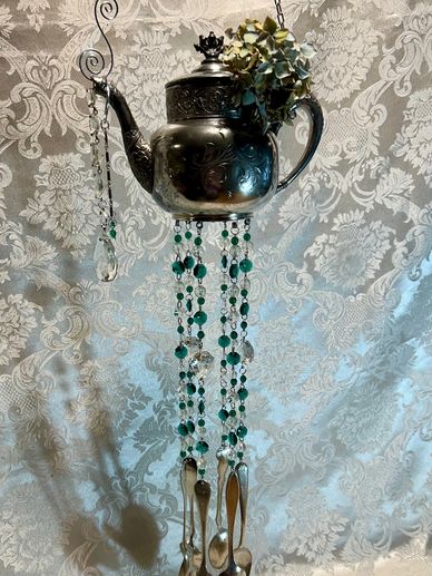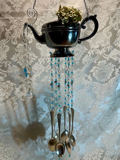 Silver plate teapot with 8 strands of glass beads leading to silver teaspoons. Vintage Chandelier glass pours from the spout.