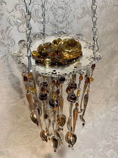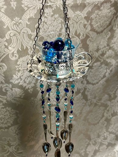 Nothing but blue sky with this wind chime. Glass beads and silver spoons surround a center faceted gem.