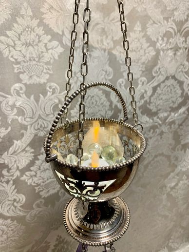 Silver plated sugar bowl cut and twisted into vines. 5 strands hang from the bowl, decorated with glass beads ending with silver plated spoons.